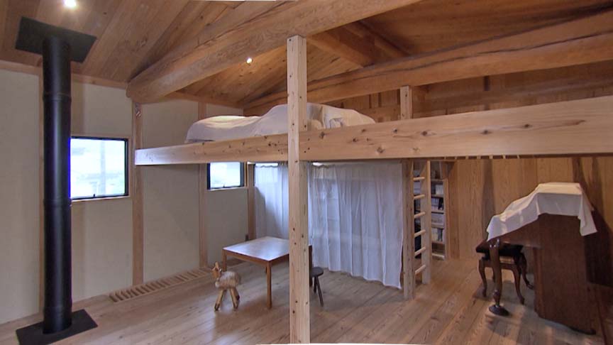 トイレと浴室以外に建具は無く、家全体がひとつながりの空間。床の一部をルーバー状にして空気を循環させます。寝室は後から“棚”を追加してベッドにしています。