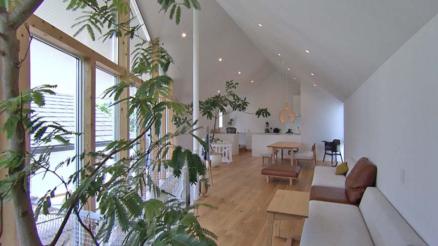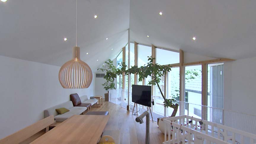 2階は約25畳大のLDKと約10畳大のテラスという構成。その間の仕切りは全面の透明ガラスで、東隣にある神社の森を借景する巨大空間となっています。