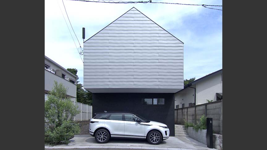 閑静な住宅地の東西に細長い敷地。1階は艶消しの黒色に塗装、2階を銀色のガルバリウム鋼板張りとしたことで、イエ型が宙に浮いたように見えます。