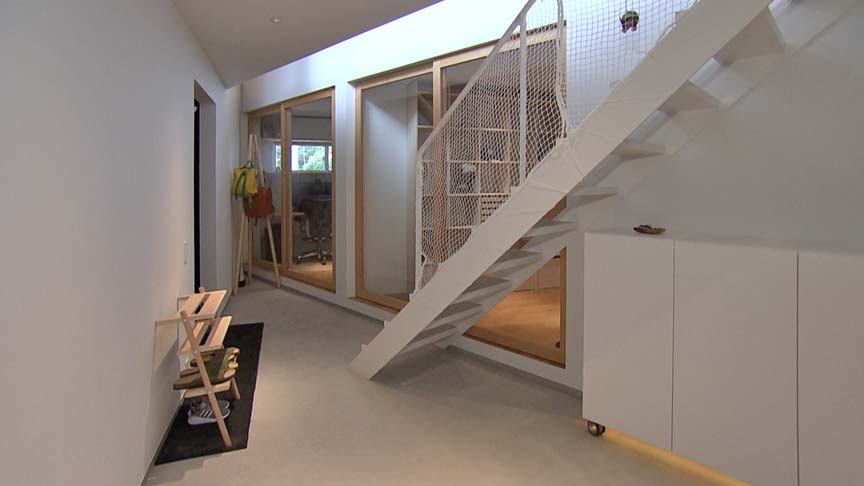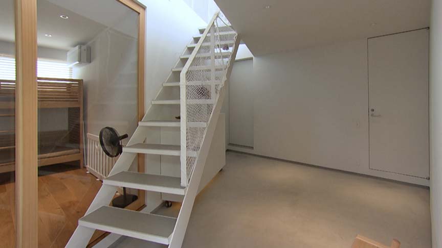 土間に隣接して洗面・浴室、書斎、2つの個室を配置。書斎と子供室の出入り口は、木製の框と透明ガラスの引き戸です。