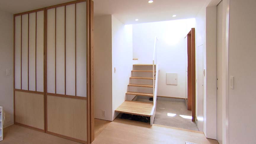 玄関は約5mの吹き抜けで階段までが一体空間。加えて隣接する子供室の障子を開け放つ事で、さらに広大な空間とする事ができます。横桟の無い障子戸はオリジナル。