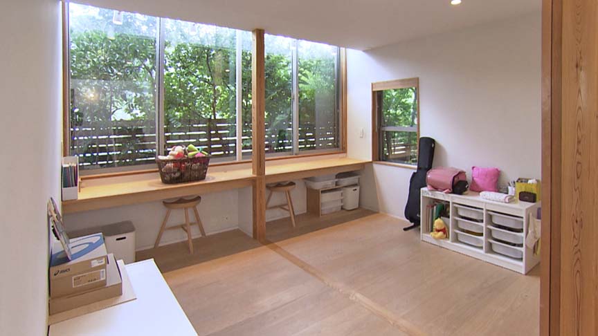 子供室も西面に大窓を設けました。その窓を庭木が埋めつくします。窓辺に設けた横長の造作デスクの上は、細長い吹き抜けで2階につながっています。