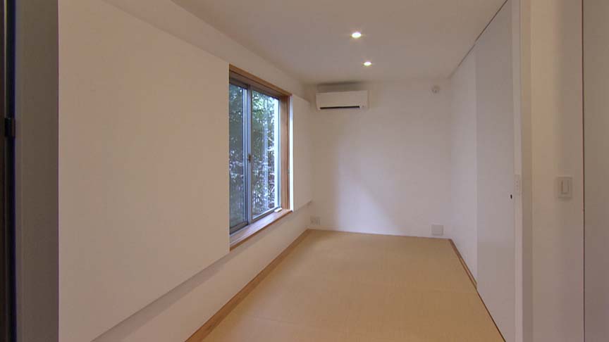 細長い寝室は畳敷き。画像左手の窓からも庭の花壇を眺められます。隣接してウッドデッキテラスも設けています。