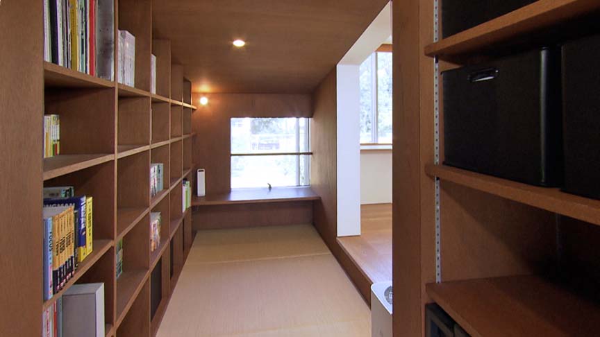 LDKに隣接するのは家族共用の図書室。床を一段下げ、内装色を濃い茶色として、開放的なLDKとは対照的な籠もり感を演出。床は畳敷きです。