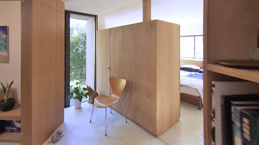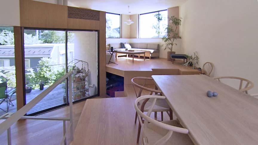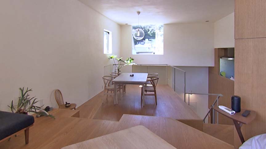 2階は3つの箱にによる3つの床レベルがあり、一番高い箱の上が居間、中間が食堂、一番低いのが台所となっています。台所のレベルにはバルコニーもあります。