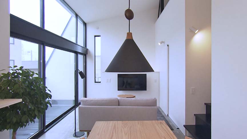モノトーンでまとめたLDKは約12畳大。窓の無い正面外観とは打って変わって南面に大開口があります。勾配天井は最大3.8mあり、その高さを生かしたロフトもあります。