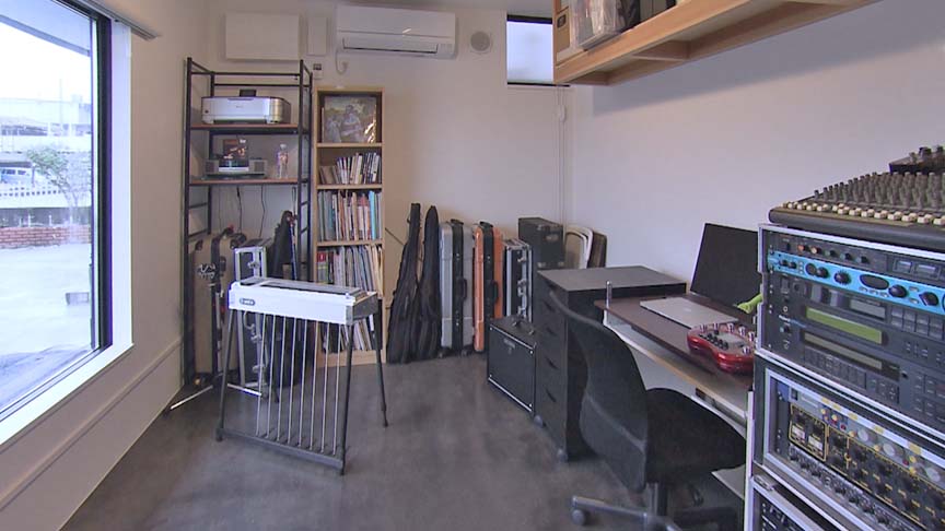 建主はペダルスチールギター製作者。1階正面側に顧客との打ち合わせなどに使用するショールームを配置しています。