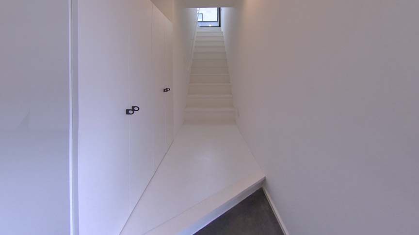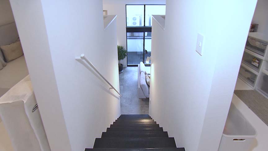 玄関に入ると、墨色の土間以外、白一色の世界。1階レベルに窓は無く、2階の窓から入る光が訪れる人を導くように感じさせます。
