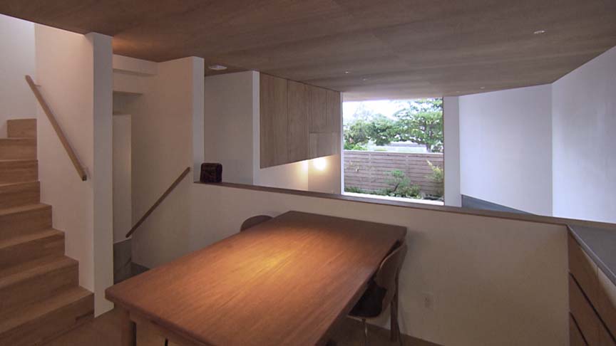 居間よりも床が95cm高くなった食堂・台所。緑道の景色を取り込みつつも、前面道路から距離があり、さらに床が高い分小さくなった天井高で落ち着きを演出しています。