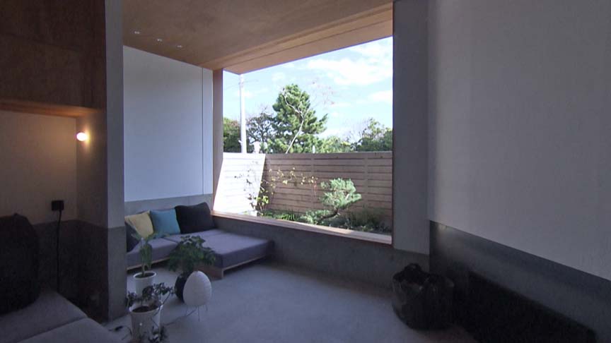 道路を挟んで川と緑道がある敷地。景色を取り込む大窓を設け、同時に下部を木の壁で囲むことでプライバシーも守っています。外壁のグレー部分はそとん壁。