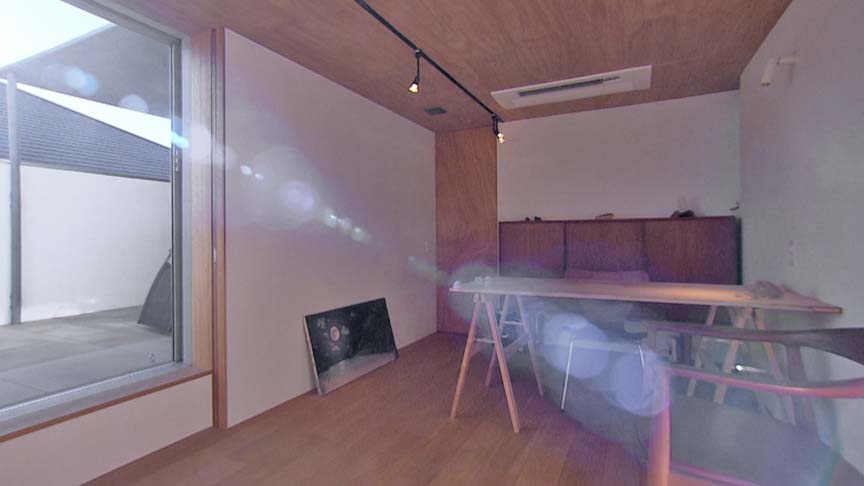 約10畳大の書斎。天井はラワン合板、壁は珪藻土、床はオークです。隣接する広いバルコニーは、バスコートを兼ねています。