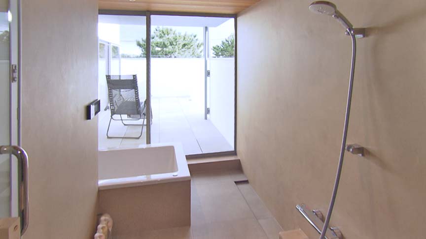 浴室は約9畳大のバスコート付き。画像の外ですが、サウナ室も隣接しています。天井はラワン羽目板、壁はモールテックス仕上げです。