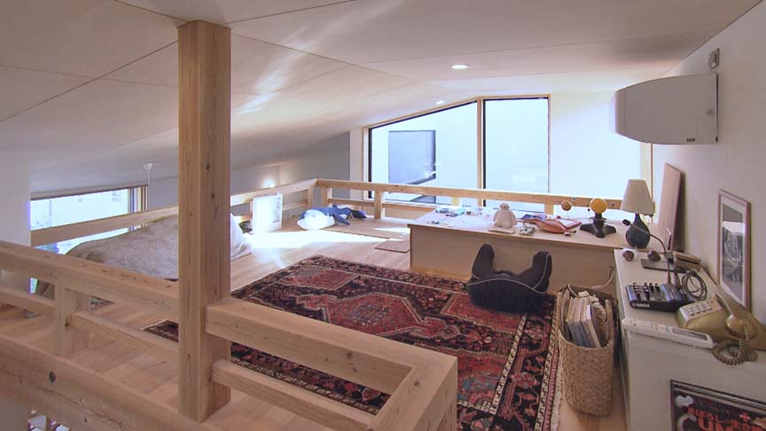 2階はバルコニーを抱くL字形のLDK。台所の上にはロフトもあります。北東角は、山の景色を取り込むコーナー窓。東面のガラス戸は引き込んで全開可能です。
