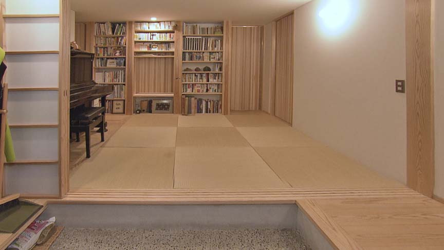 玄関を入ると畳敷きのフリースペース。正面の壁一面が本棚になっています。障子戸で個室にもなる他、各部屋への動線の起点ともなっています。