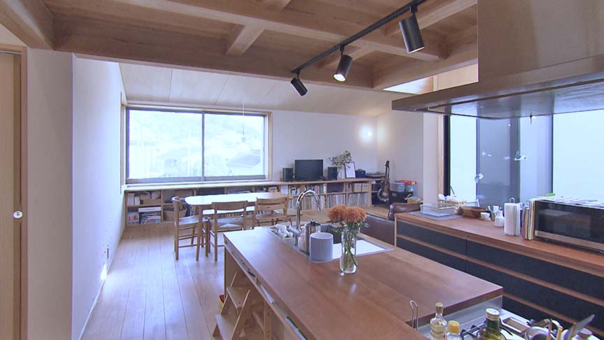 台所の上のロフトはテレワークの作業場であり、子供の遊び場でもあります。窓から海も望めます。