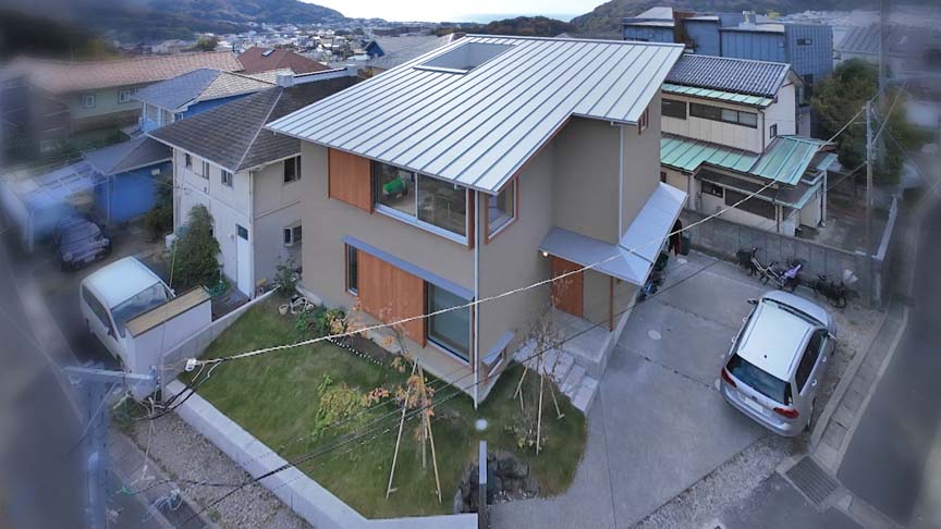 海と山の間にある住宅地の北東角地。落ち着いた色合いの左官壁に加え、戸袋部分に木を張ってアクセントとしています。芝生や大谷石の階段など外構にも凝っています。