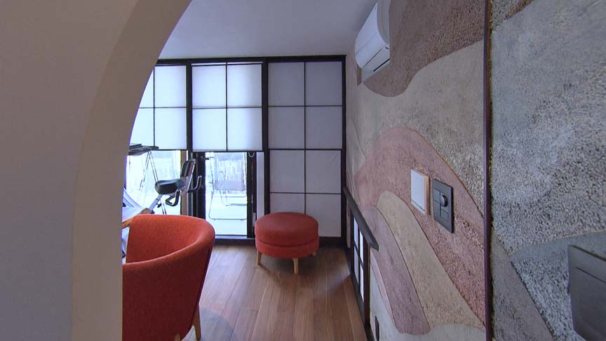 “塗り版築”の廊下の先にある書斎。LDKから少し距離がある“離れ”感覚の空間。三方が窓になっていて、その内側には雪見障子を付けています。