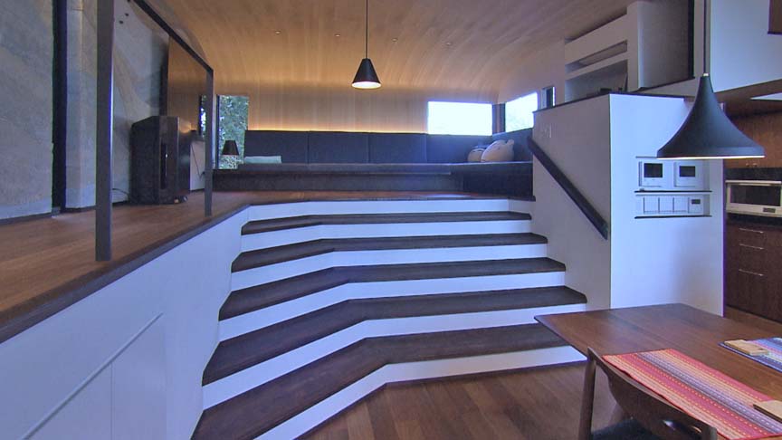 LDKも起伏の多い周辺の地形を再現した空間。下段に食堂・台所、冗談に造作ソファの居間を配置し、間をスタジアムの観客席のような幅広の階段で繋ぎます。