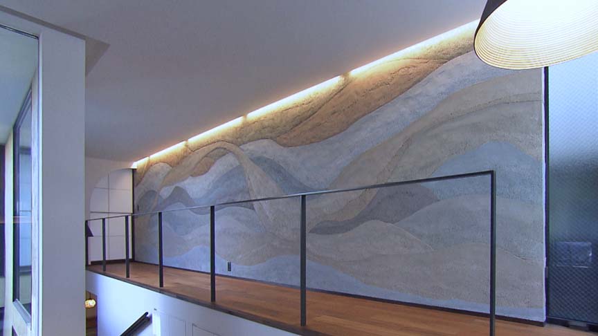 居間から南に伸びる廊下の壁には“塗り版築”で砂漠の景色を描きました。その幅は13mに及びます。建主は足繁く現場に通い、佐官職人と共にデザインしたそうです。
