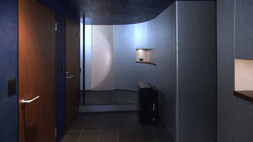 玄関ホールは敢えて薄暗い空間としています。壁の銀色の部分は銀もみ紙、藍色の部分は土佐和紙を張っています。正面の半円形窓の手前に組子細工の障子を付けています。