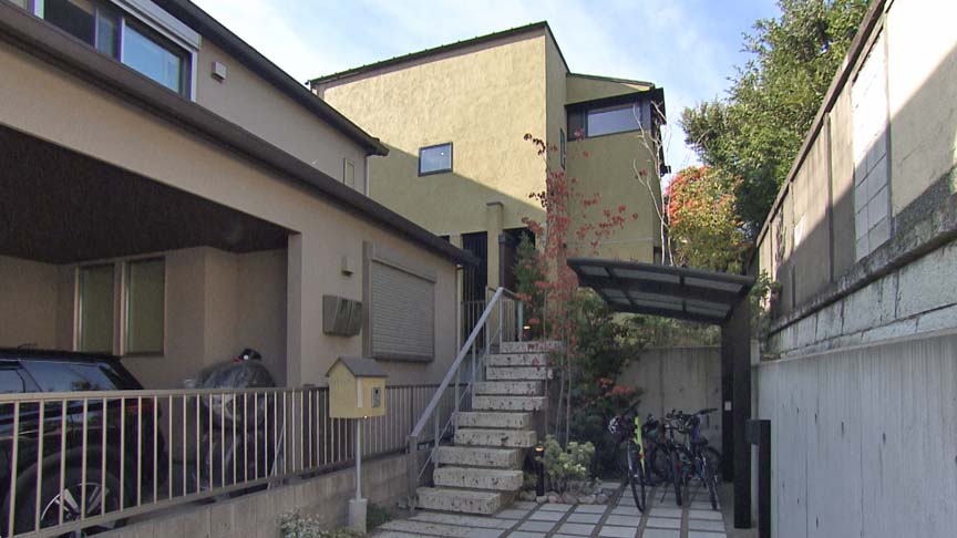 都心の起伏の多い地域にある旗竿地。敷地内にも高低差があり、建物は道路よりも大分高い位置にあります。大谷石の階段、植栽いっぱいの前庭など外構にも凝っています。