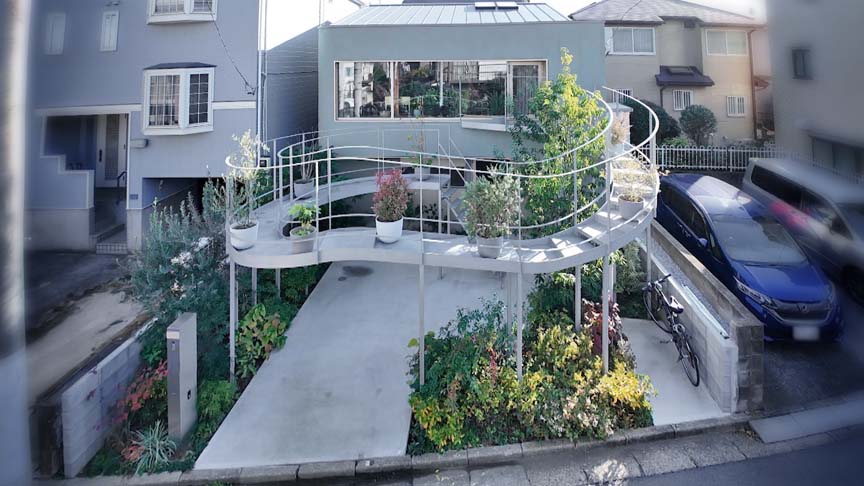 庭へ向けて明るく大きな窓のついた家が欲しい。その想いから⾃邸の計画は始まりました。敷地は道路以外の3方向が立て込んだ住宅地のため、道路側に庭と窓を設けることとしましたが、道路は北側に位置していたため、窓越しにどのように明るい風景をつくるかが課題となりました。そこで建物の影を逃れ、太陽の光を求めるように道路際を迂回する空中テラス「飾り庭」をつくることで、北向きの窓の景色に煌めきを与えています。