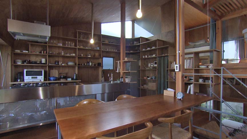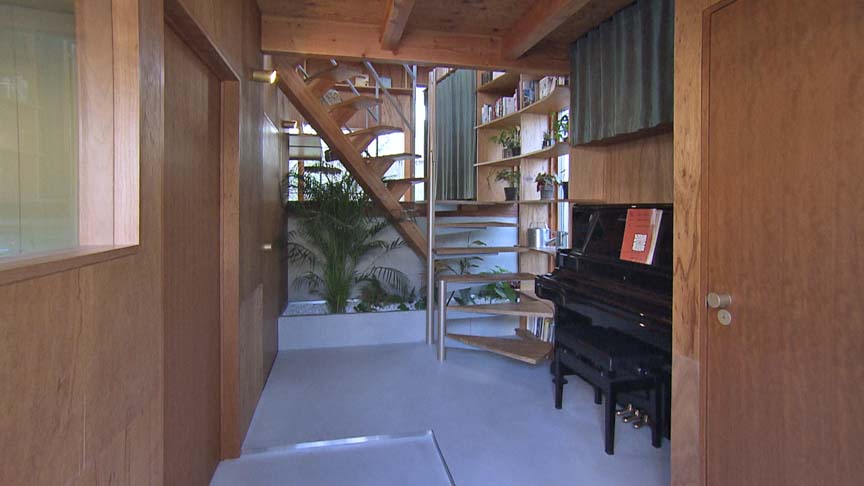 内部は玄関、客間、ダイニング、寝室が螺旋状につながり、敷地の高低差を利用したスキップフロアが庭への視線の抜けを生んでいます。さらに大切な器、本、植木などを飾るための棚で包まれた小さな美術館のような動線が、肌理細やかな生活への意欲を高めてくれます。