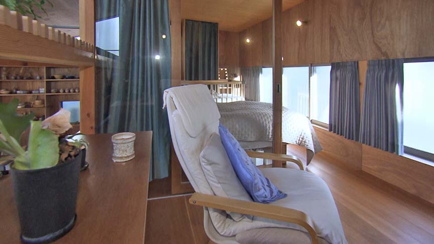 室内は4層のスキップフロアを採用した大きなワンルーム。天井・床はラワン合板で統一。造作収納など所々に曲線デザインが施され、宙に浮くテラスとの連携を感じます。