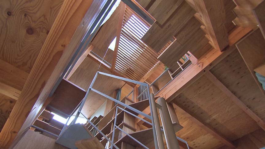 素材・形状などバラエティ豊かな階段が連続。天窓の真下に造られたスノコ状の棚は、鉢植え植物の冬の居場所です。
