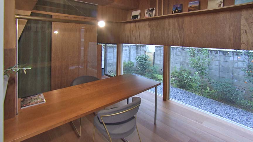 1.5階は建築家である建主(夫)の仕事場。手前に応接室、奥に書斎があります。隣家と目が合わないようにしつつ裏庭(南庭)を楽しめるよう、窓は低く配置しています。