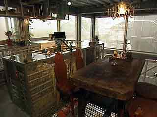 | 長洲さんのお宅は都心の狭小の敷地に建っています。この土地を見てなかなか買おうとは思わないのですが、ご主人はさすがに建築家です。出来上がった住宅の展開、想像、構成は見事です。実に感性豊かないい建築だと思います。地下1、2階とコンクリートで地上1、2、3階が鉄骨造です。地上階に柱はあります。しかし、壁がない。4方全て大開口です。これも珍しい。南側がふさがっているということでの苦肉の策なんですが、実はこれが素晴らしい開放感をもたらしてます。それぞれフロアによって目的が違いますが大きくひとつにつながっています。そして、屋上庭園では、ダンちゃんが元気でした。あの緑がとても素晴らしい。普段は近隣と交流の無い屋上で手をつなぎ合う、新しい発想と言う感じが致します。 | ||||||||||||||||||||||||||||||||||||