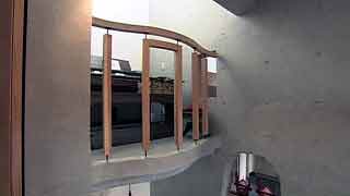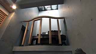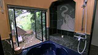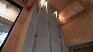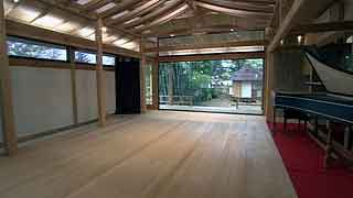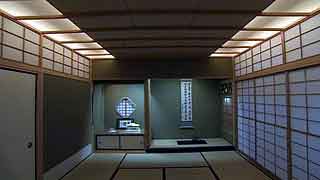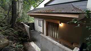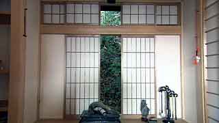 | 最初に敷地を拝見させていただいたときのことを今でも憶えております。普通の業者さんだったら逃出してしまいそうな崖地に、うっそうと生い茂る武蔵野の原生林と竹やぶ。しかし、私はそこに、そう、かぐや姫でも出てきそうな「何ものかおわしまする…」感じに誘われて、快く設計を引き受けたのであります。そして設計へと突入。 煎茶や地唄舞、バロック音楽という施主自身から引出される強烈な「固有性」に、私が建築家としてのプライド、つまり建築の「構成原理」をそこに与えることができるかどうかがポイントになりました。施主とともに京都に通って一緒に茶室を実測したり、国立劇場で舞う施主の姿から何か手掛かりを引き出そうとしたり…。 結果的には、私と施主の両者の想像を遥かに越えた未知のニッポンの空間がそこに出現しました。 |