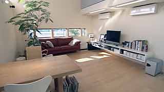 | 木造で一部がキャンティレバーの松宮邸。1階は奥さんのアトリエと水回り。2階は室内テラスを中心に、折れ戸の開閉によって、自由自在に空間を変化させることができます。吹き抜けになっている居間・食堂スペースには高窓から色々な光が入り、さらに空間の変化を楽しめます。家具・インテリアも洗練されていて、まさに『見巧者が建てた家』といえるのではないでしょうか。 | |||||||||||||||||||