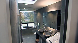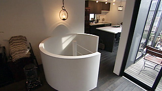 なだらかな稜線と竹林に囲まれた高台の敷地。海にも歩いて行ける距離です。そこに立つ、新築なのにどこか懐かしい印象の建物。ご夫婦で集めた家具・小物がそれぞれの空間に見事に納まっています。建築家が建て主のことをよく理解している証ですね。 私が気に入ったのは、玄関から続く通り土間です。つい部屋にしてしまいたくなるところですが、あえて余白にすることで、空間に豊さを生み出しています。絶景のお風呂に入れば、一日の疲れもふっとんでいまうに違いありません。 |