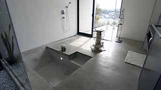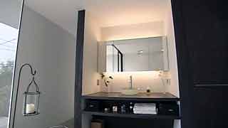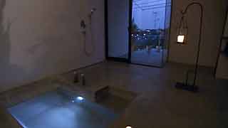 南国リゾート好きなオーナーご夫妻は、公園の緑を望む見晴しの良い高台に位置するこの敷地に、旅行先でのバス体験に基づいた開放的かつ快適なバスタイムを希望しました。 それは、極めて限定的な入浴のためだけのバススペースでは無く、拡張して生活全般を取込んで行くようなイメージでした。そこで、通常の浴室が持つ境界を極限まで取り除き、建物動線の中心である土間・階段とボーダレスに配置することで、生活動線の一部として生活の中に常に作用するバススペースを計画しました。 床の防水コンクリートを刳り貫いただけの浴槽は水の張られた泉となり、バススペースは土間から外部へと連続する広場になり、水面は空を写し込み、照明の光を反射して坪庭を通してオープンスペースにゆらぎの変化を与えます。 開放的なバススペースはその形態だけでは無く、確実にライフスタイルにボーダレスに溶け込んでいます。 |