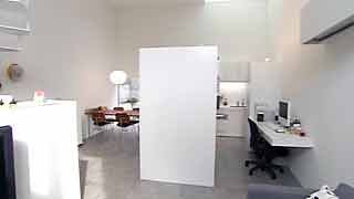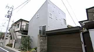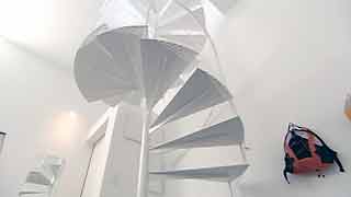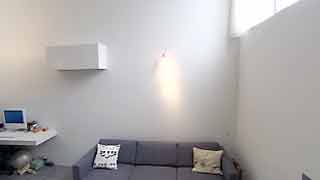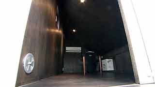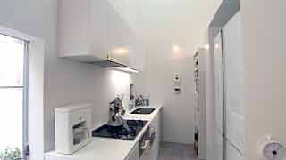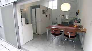 1階はワンルームのLDK。床を地面から1メートル掘り下げ、2階の床=天井を目いっぱい高くすることで実現した広大な空間です。建坪10坪のコンパクトな住宅とは思えません。