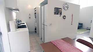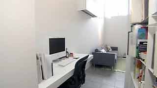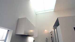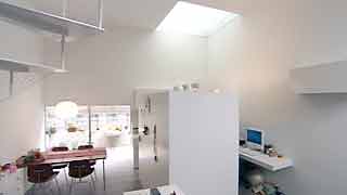 天窓からの光で明るいキッチン。隣には奥さんのオフィススペースも設けられています。家事と仕事を両立しやすいよう考え抜かれた動線です。