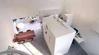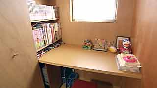 鮮やかな黄色の子供室。幅1.2メートルのコンパクトな部屋ですが、傾斜した天井や机の前の窓から視線を抜くことで、狭さは感じません。 |