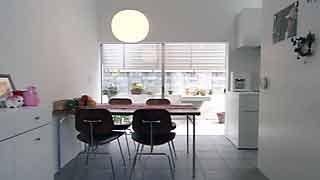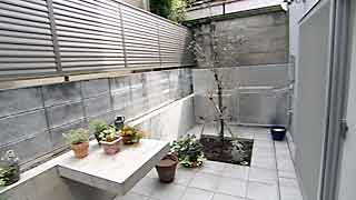 ダイニング脇の窓のガラス戸は引き込んで全開できます。裏庭は、LDKと同じ磁器質タイルを敷いて一体感を演出。奥さんは、ここでガーデニングを楽しんでいます。