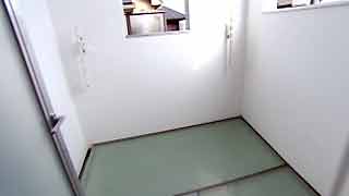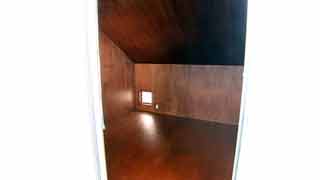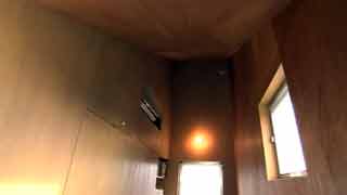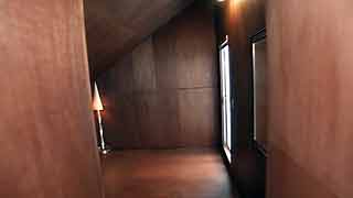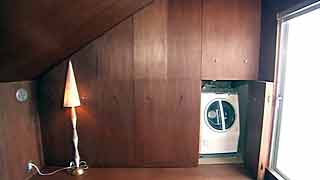 赤茶あるいは赤ワインのような色で塗られた落ち着ける寝室。壁収納の一部には、なんと洗濯機が!水回りを広くとるための工夫です。