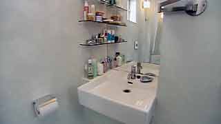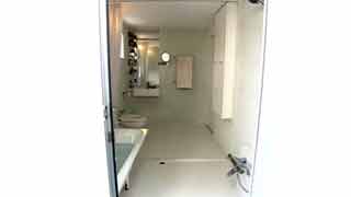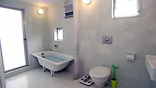 薄い青緑色のお洒落な水回り。輸入物の便器や脚付きの浴槽が外国のホテルのような雰囲気を醸します。