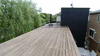 緑道沿いのロケーションを活かして、緑道の樹木を借景として取り込むこと・周囲景観に溶け込むことを意図しました。前面の柳は、自然のスクリーンとして陽射しや視線を適度に遮ります。1階はピクチャーウィンドウ、2階では屋根全面をデッキ張りとして、自然を満喫できる仕掛けです。 |