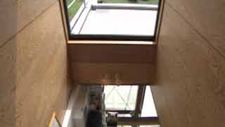 玄関から見た吹き抜け上部。天窓から明かりがたっぷり入ります。長いカウンターは、お子さんたちの勉強机です。 |