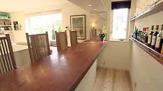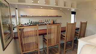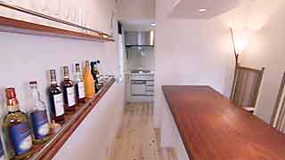 | 人生は楽しむべきもの、建物はその舞台です。ご夫婦の趣味が最大限に生かされた建物です。 まずは、ゴルフ。建物内部にドライバーがフルスイングできる練習室を設けました。そのために他のスペース、なんとリビングダイニングを縮小してしまったという思い切りの良さに脱帽です。 続いてバー。大きなカウンター、オーダーメイドの椅子で、大好きなお酒を楽しめる場所です。これも趣味性の高い場所です。 そして、愛犬のためのスペース。リビングが無くなっても、愛犬の居場所はしっかり作る。本当にワンちゃんを可愛がっているというのが伝わって来ます。 |