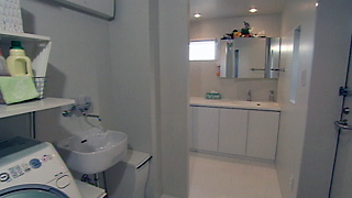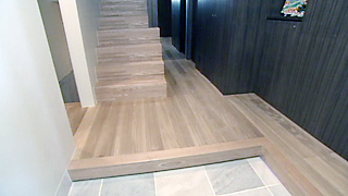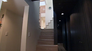 全体に明るさを抑えて、リビングへと自然に導かれる玄関ホール。姿見の鏡はマジックミラーで、照明を点けるとウェディングドレスが浮かび上がります。 |