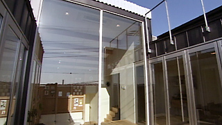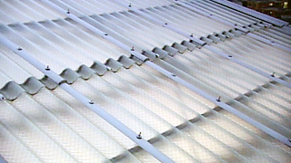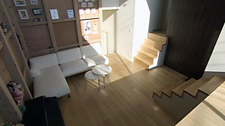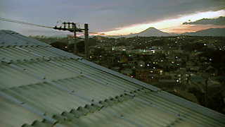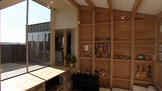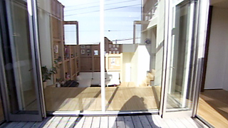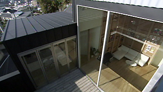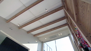リビングの天井は透明の波板ガラスと半透明の断熱材の組み合わせ。室内に光を落とし、夜は逆に屋根が夕闇に浮かび上がります。 |