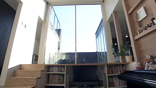 テラスから1m低い床レベルのリビング。高さ3.5mの大窓が空だけを切り取ります。“余計なもの”が視界に入って来ない、気持ちの良いリビングです。 |