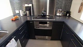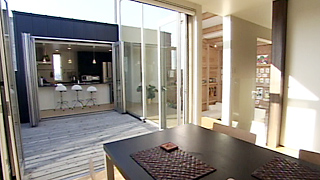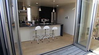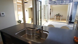「コ」の字型の機能的キッチン。テラスに面した折戸を全開すれば、テラス〜ダイニングまでが一体になります。晴れた日のランチが気持ち良さそう。 |