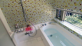 暖色系のガラスモザイクタイルが鮮やかな浴室。浴槽に入ると、やはり窓から富士山!地階のオーディオルームは壁に厚さ2.5cmの吸音材を貼っているので音質もGood! |