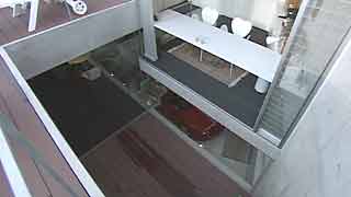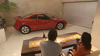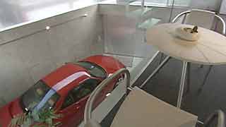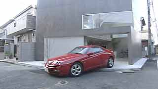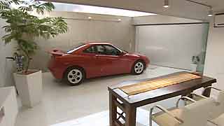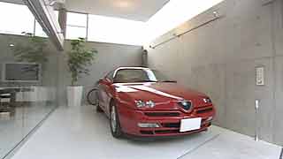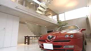 玄関はガレージ。アルファロメオが迎えてくれます。3.8mの天井には透明な階段、3面に切れ込んだスリット窓が明るい空間を作り出します。 |